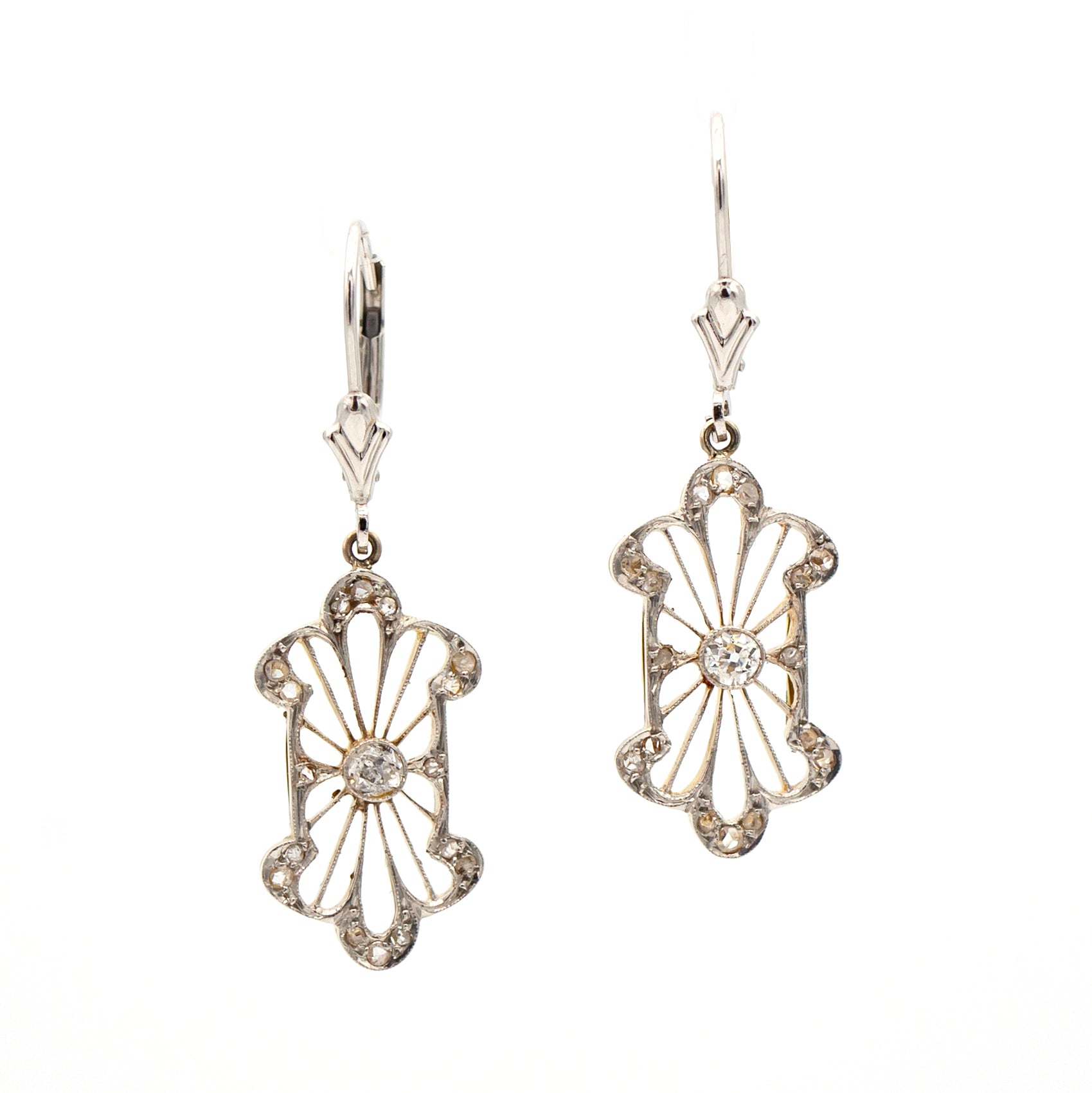 18K White Gold Diamond Art Deco Earrings, 14k leverbacks