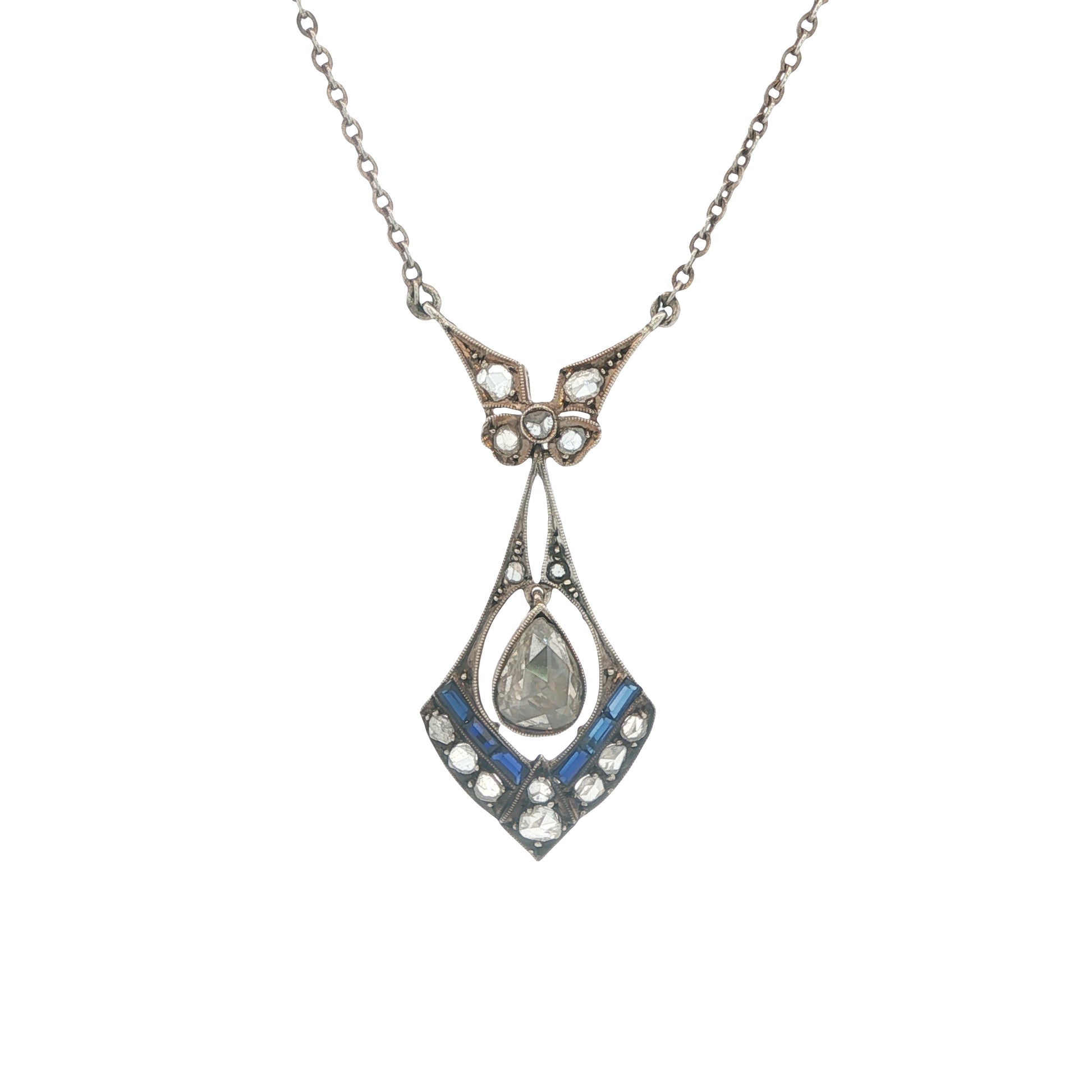Estate Collection Sterling Silver and18K Edwardian Sapphire & 0.75ct Rose Cut Diamond Pendant, 17"