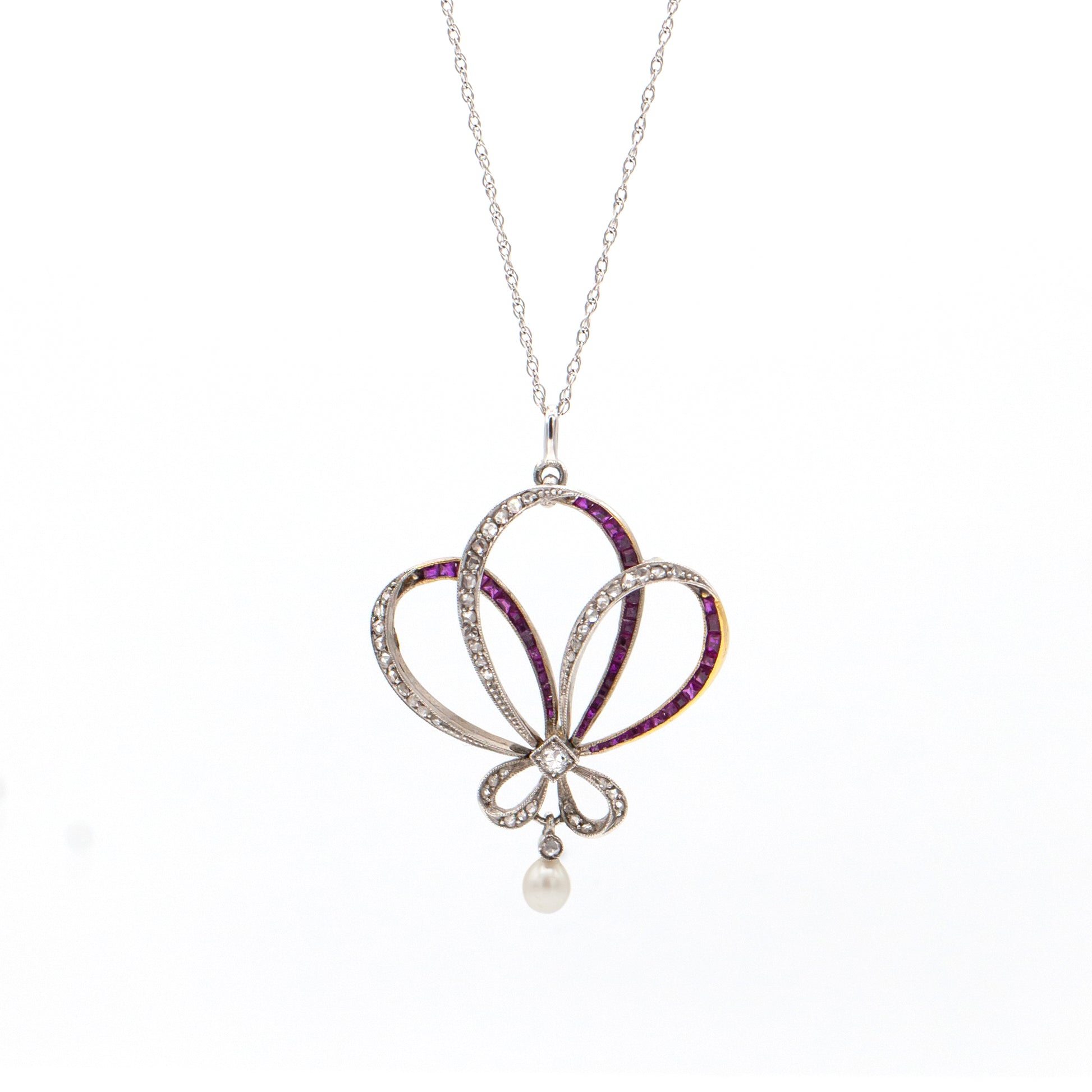 Platinum & 18K White Gold French Art Deco Diamond, Ruby & Pearl Pendant