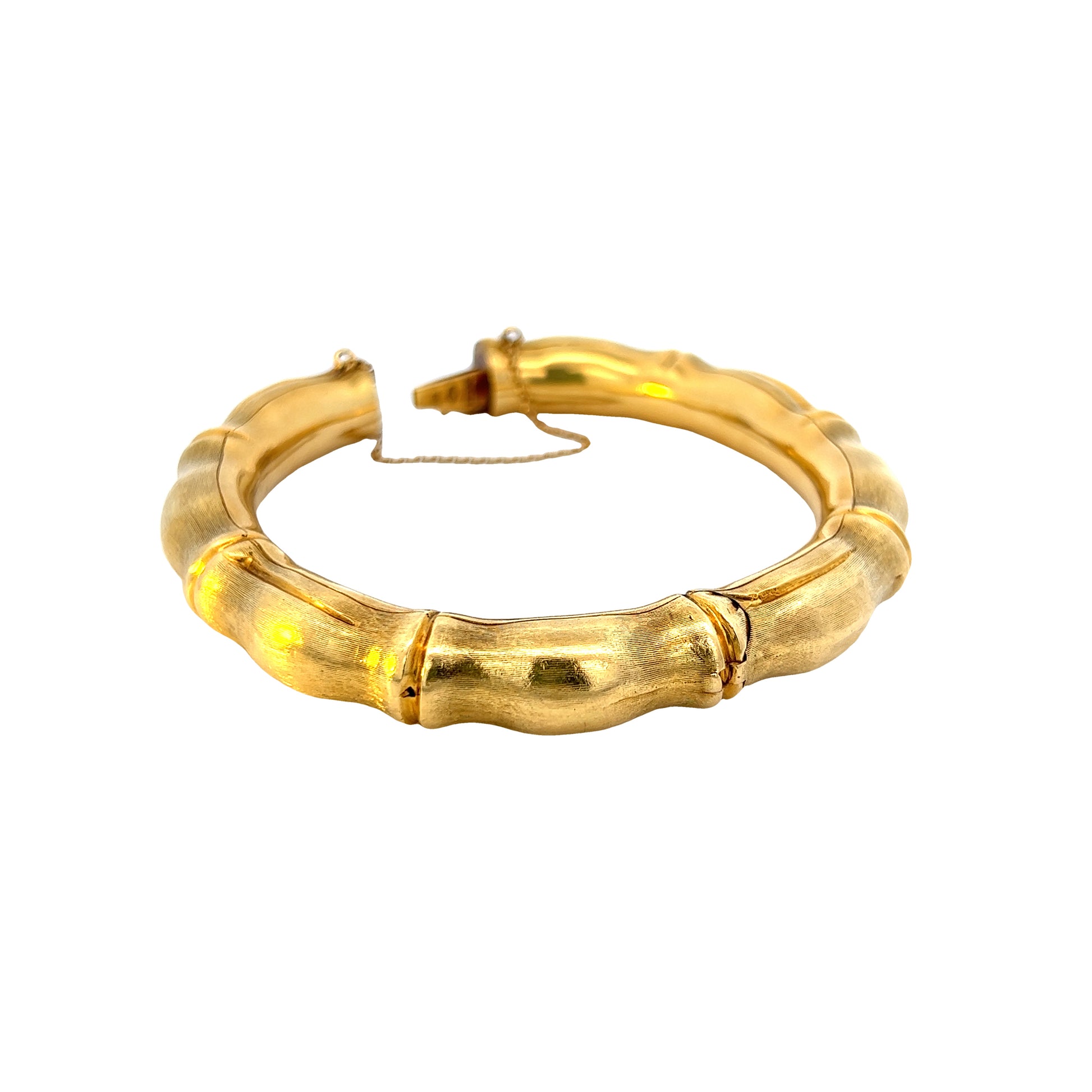 Carlo Weingrill 18K gold bamboo bangle bracelet, featuring a textured finish and safety catch. A timeless estate piece, perfect for fine jewelry collectors.
