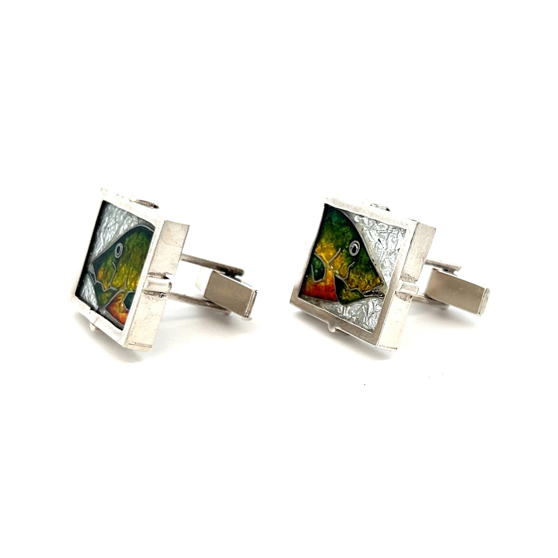 Sterling Silver Palladium Green Cloisonne Fish Cufflinks
