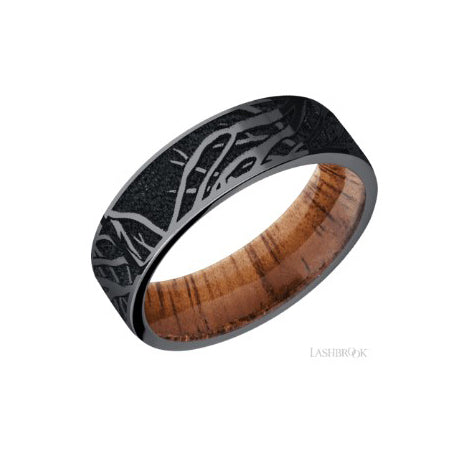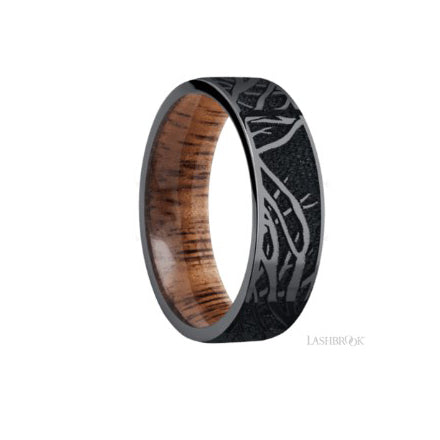Flat Tantalum Band with a laser carves Branches pattern with a Koa Hardwood Sleeve