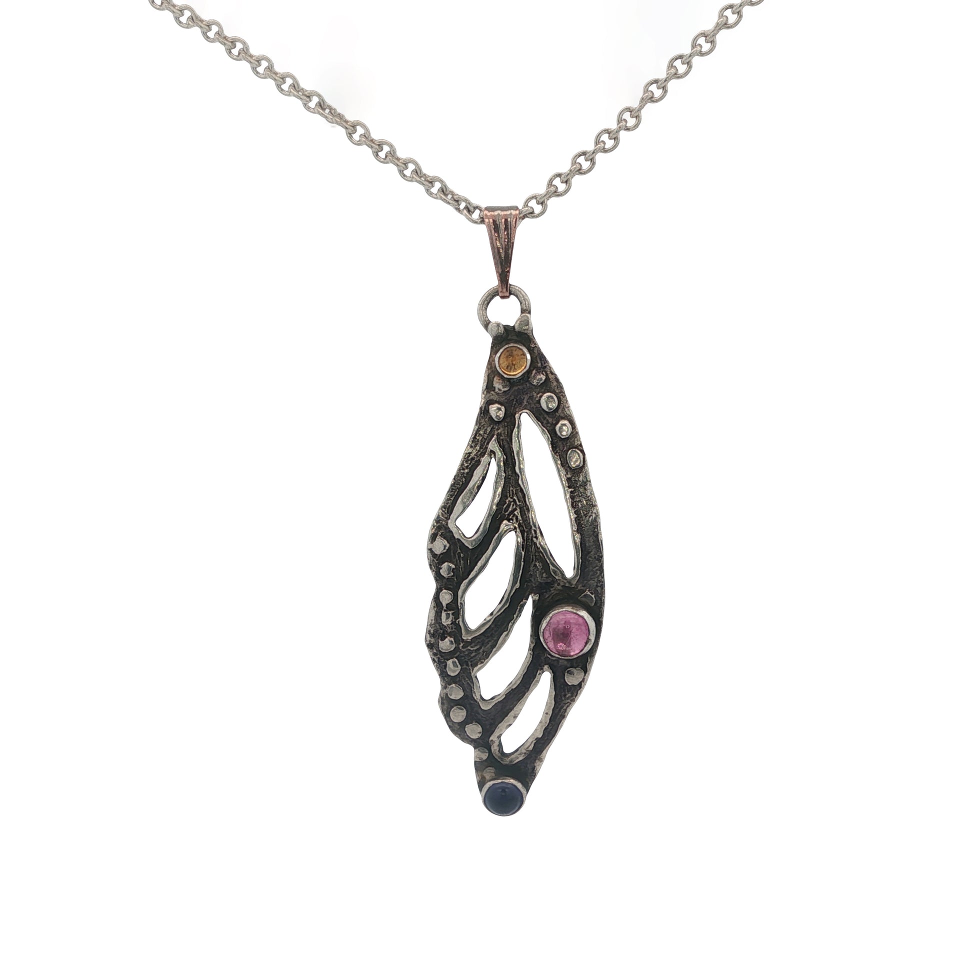 Sterling Silver Candelabra Monarch Wing Necklace with Citrine, Blue Topaz, and Garnet