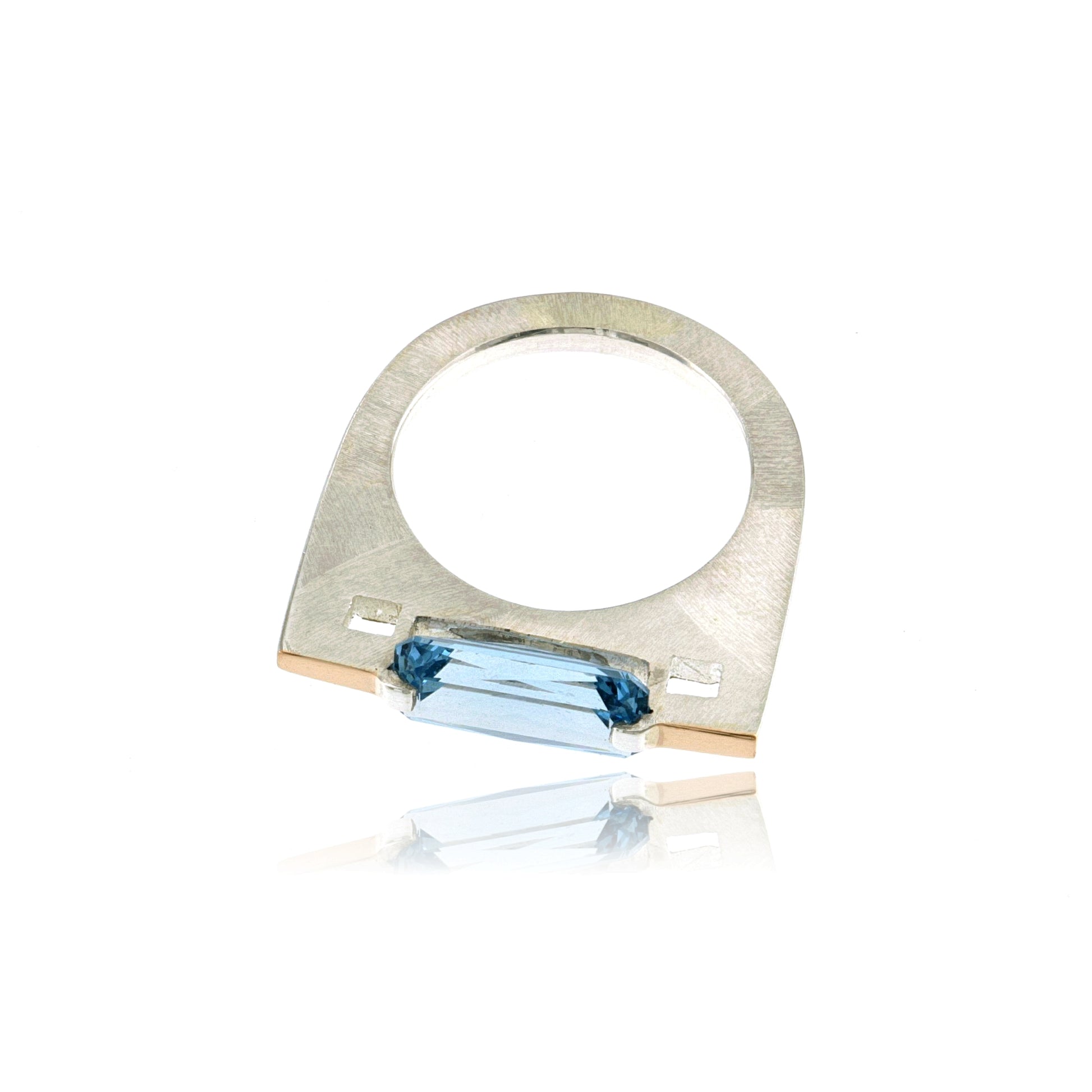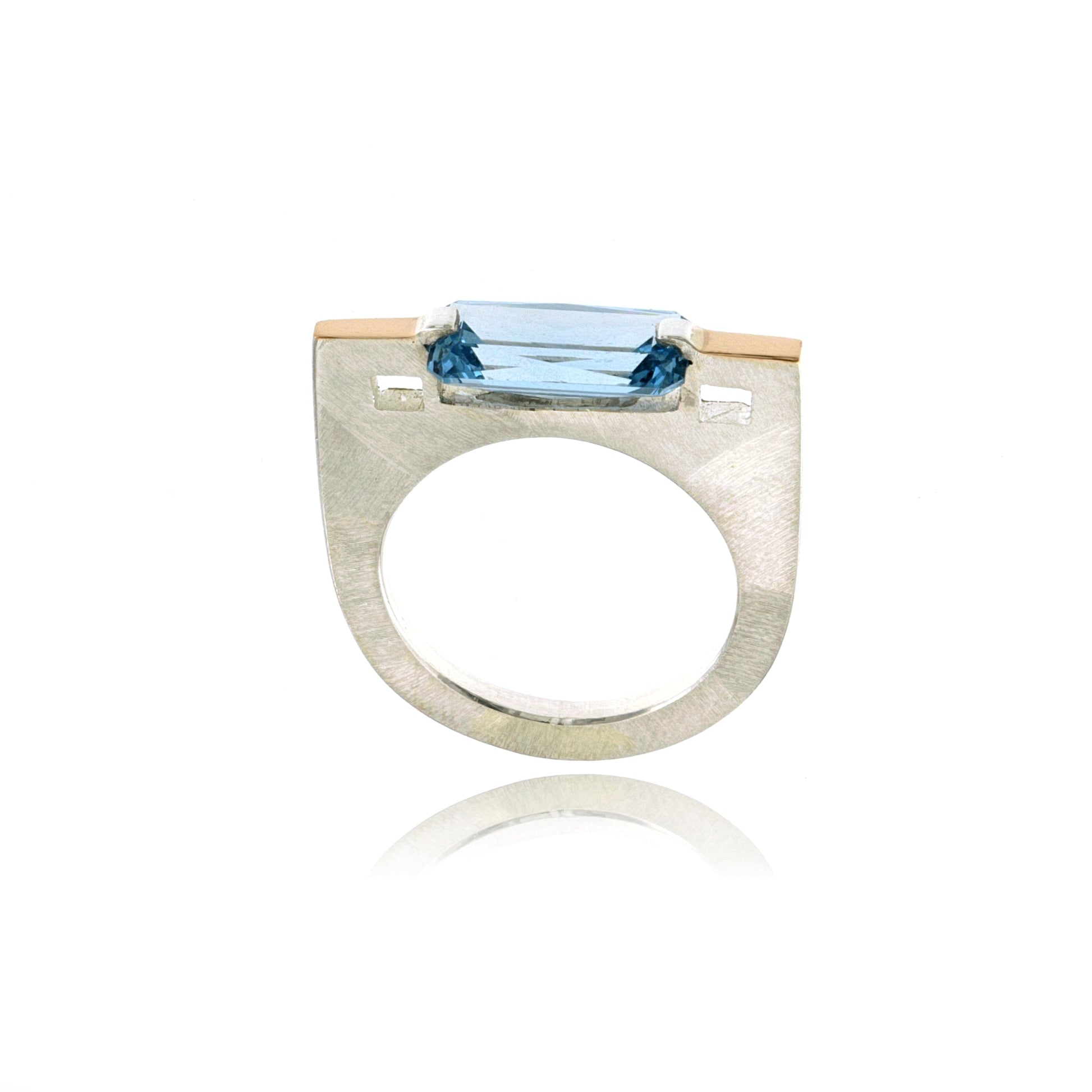 Sterling Silver textured ring with an 6X12mm lab-created blue spinel, tension set in an asymmetrical sculptural style with 14k Yellow Gold.