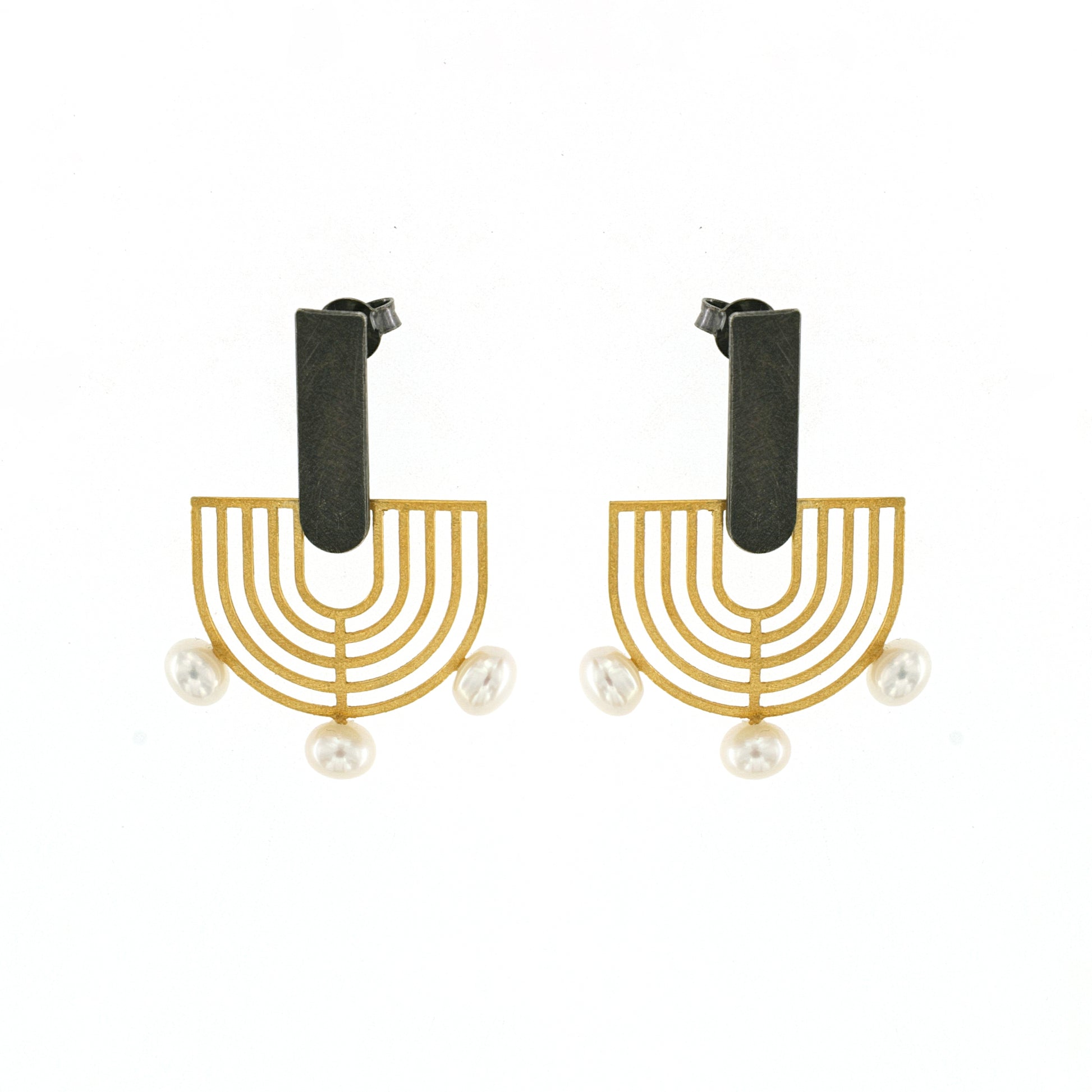 Gold Plated and oxidized sterling silver Art Deco inspired links in an open design with freshwater pearls.