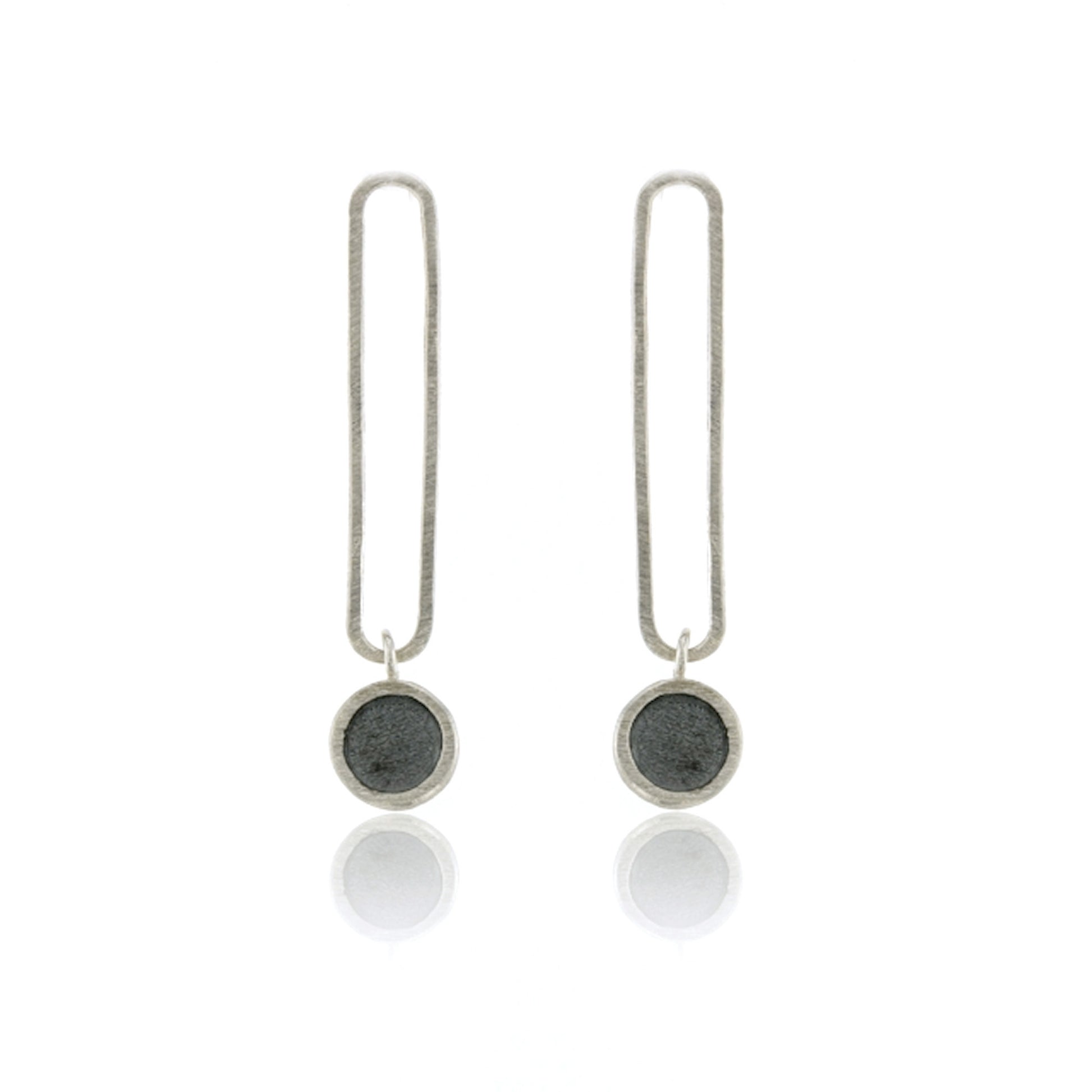 Oxidized Sterling Silver dots hanging from long open Silver ovals on posts.
