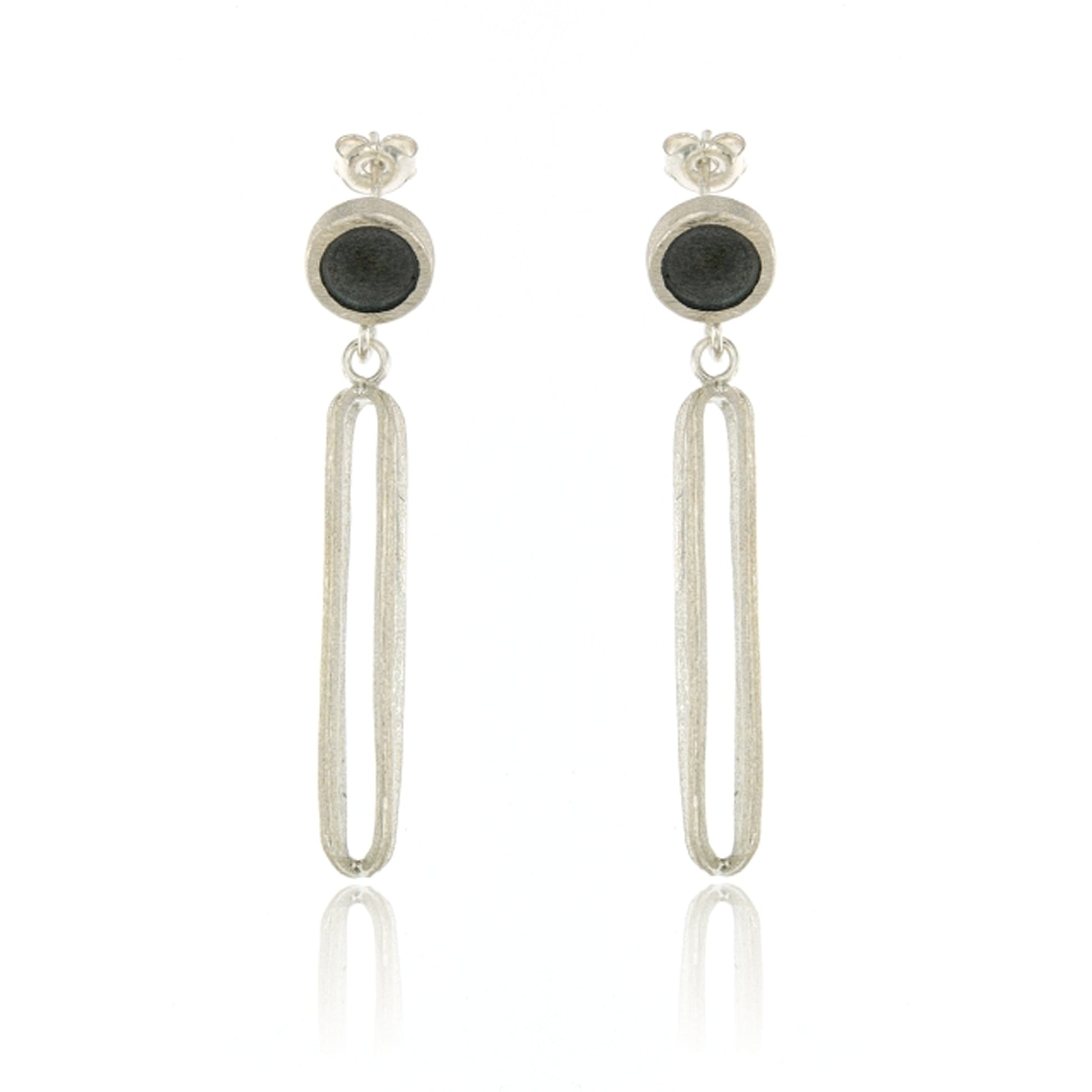 Oxidized Sterling Silver dots hanging from long open sterling ovals on posts.