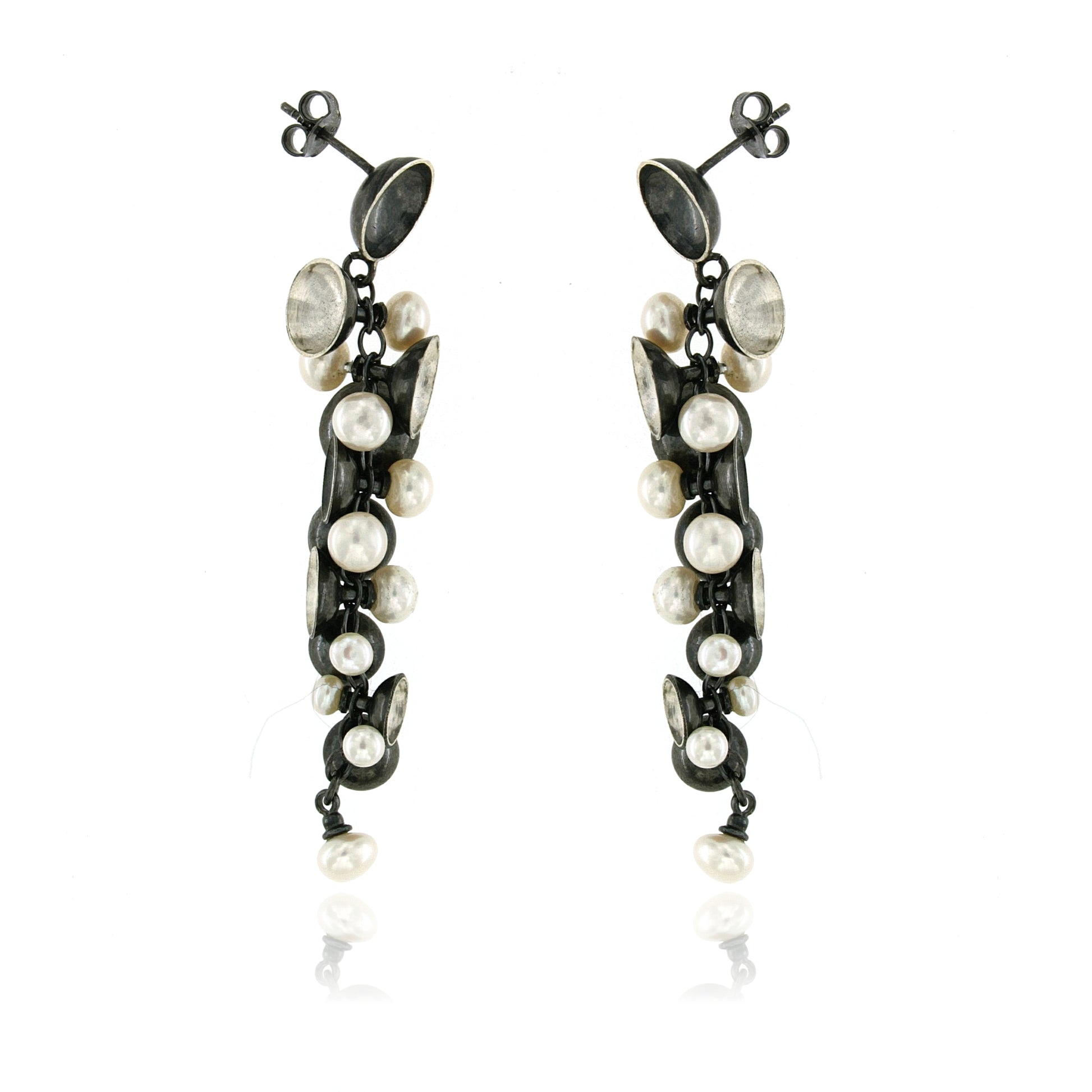 Oxidized sterling silver long freshwater pearl & silver cluster dangles.