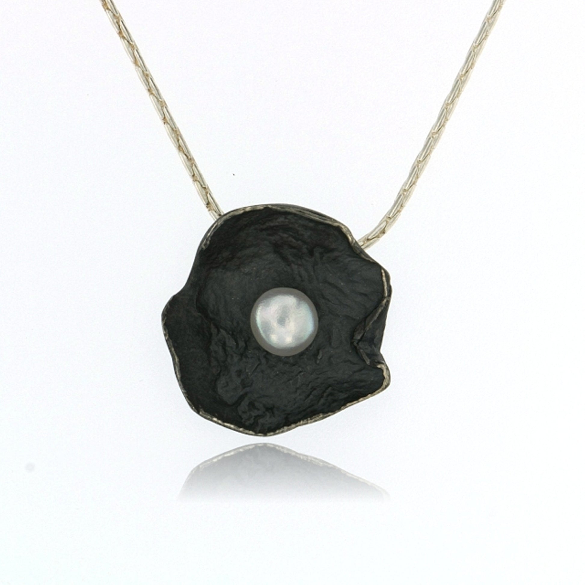 Mysterium Collection Sterling Silver Oxidized Petal Necklace with a White Freshwater Pearl