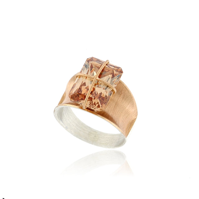 Sterling Silver textured ring with a Champagne Cubic Zirconia set in an curved rose-plated sterling band