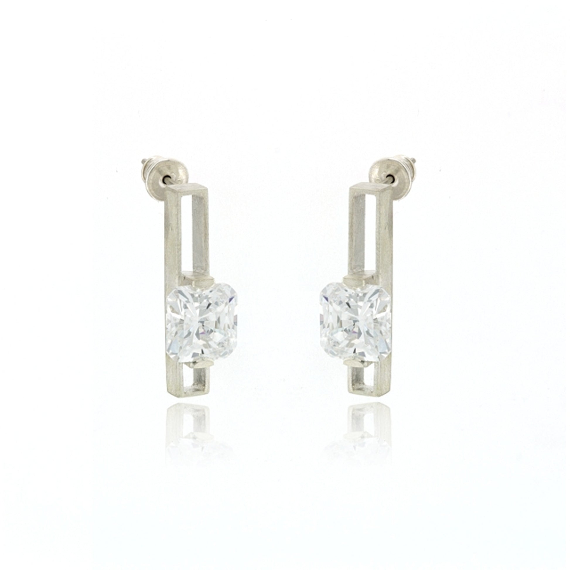 Sterling Silver 1" Post Rectangle Earrings with 9x9mm Clear Cubic Zirconia