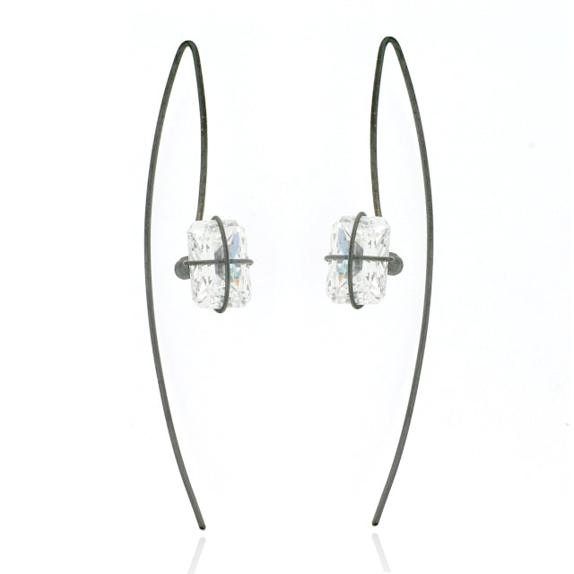 Oxidized Sterling Silver 2" Threader Earrings with present-wrapped 8x10mm Clear Cubic Zirconia