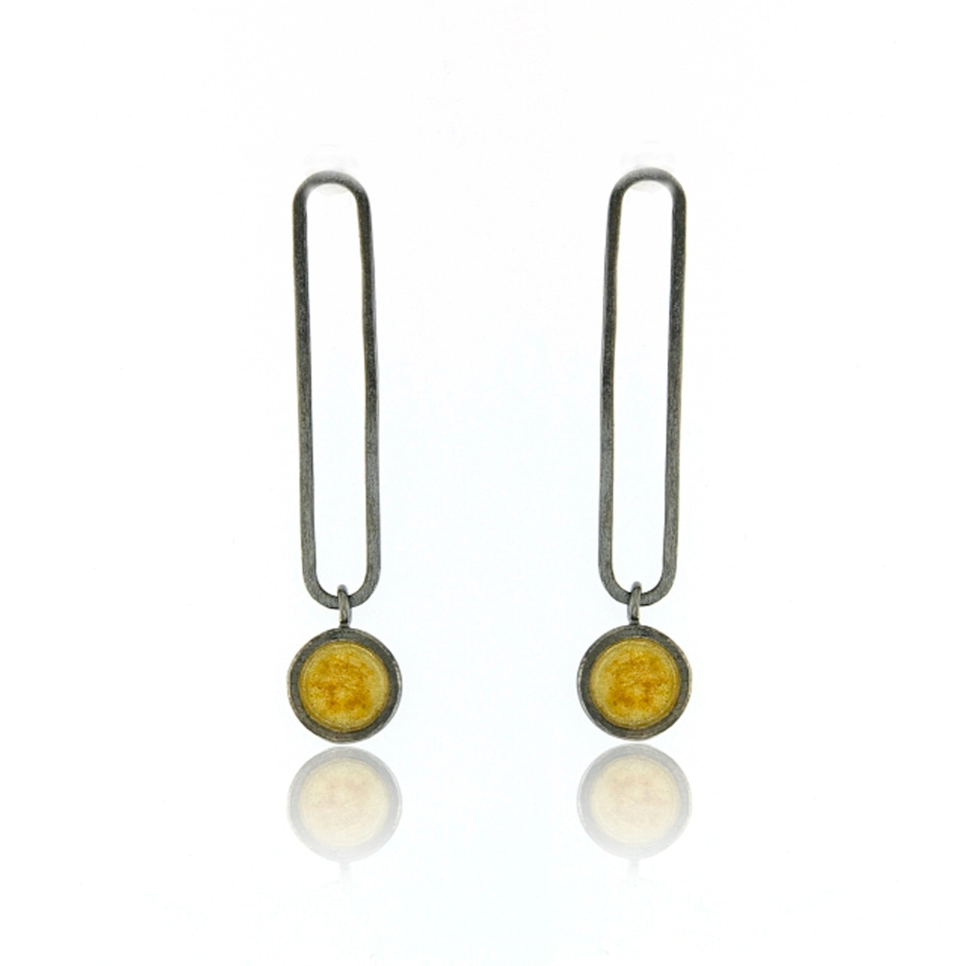 Vermeil sterling silver dots hanging from long open oxidized sterling ovals on posts.