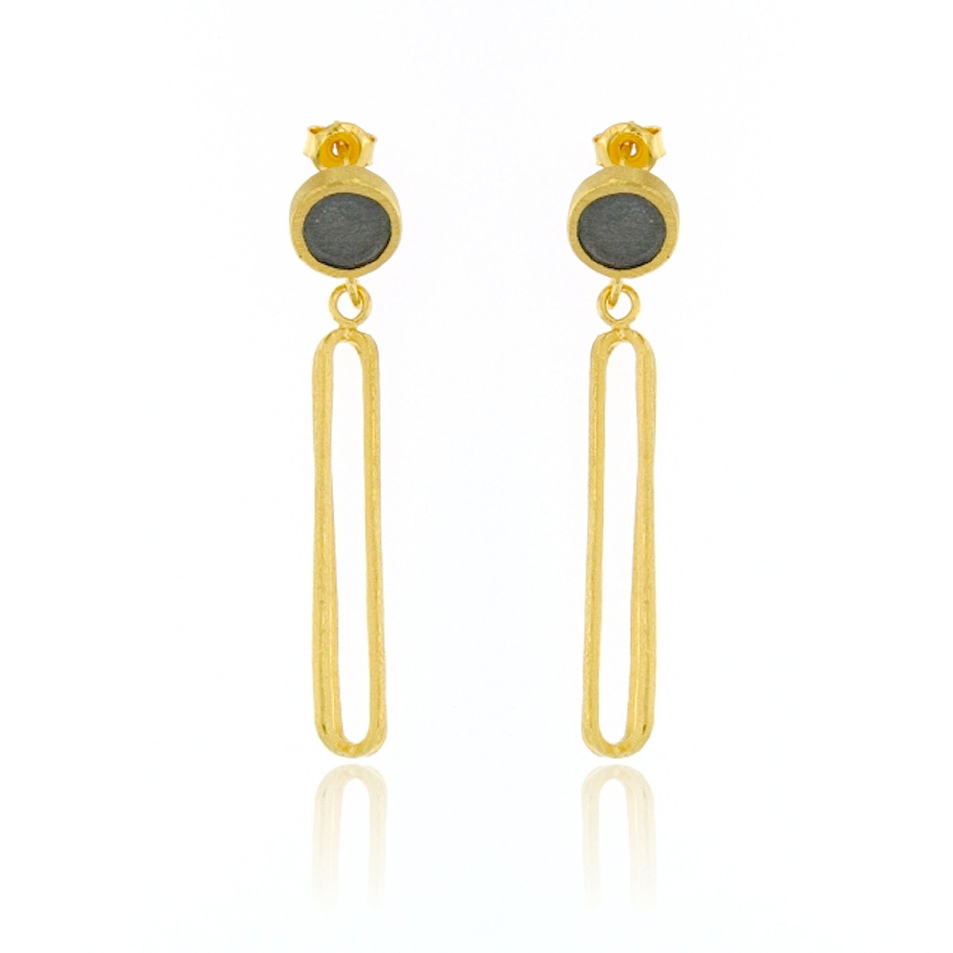 Vermeil sterling silver long open ovals hanging from an oxidized sterling dot on posts.