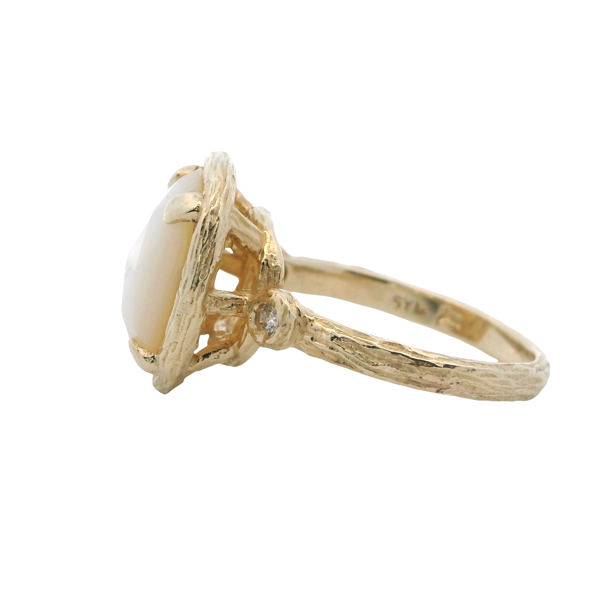 Organic branch design, featuring a stunning Mother of Pearl, uniquely faceted into a checkerboard cushion cut.