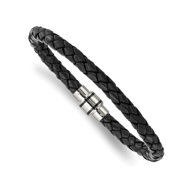 Stainless Steel Polished Black Braided Leather Bracelet