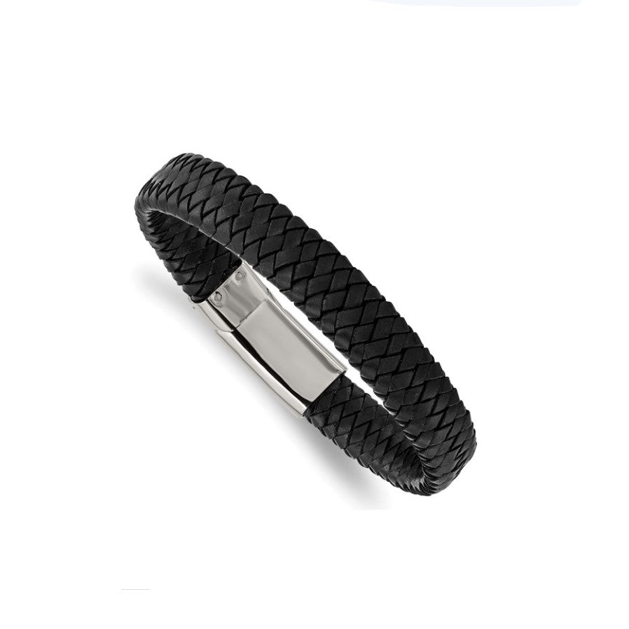 Stainless Steel Polished Black Braided Leather Men's Bracelet
