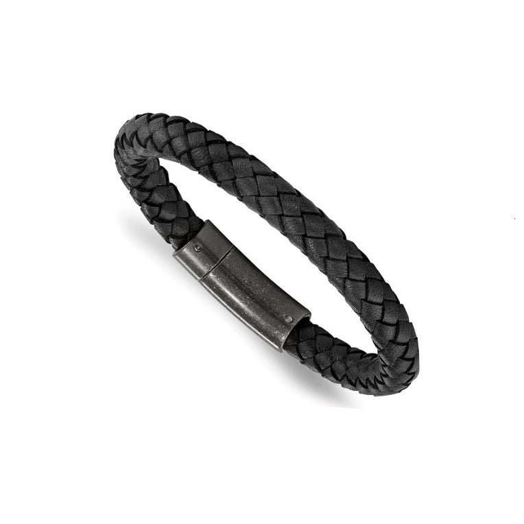 Brushed Black Stainless Steel Black Braided Leather Bracelet