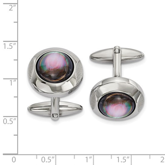 Stainless Steel Polished Black Mother of Pearl Circle Cufflinks