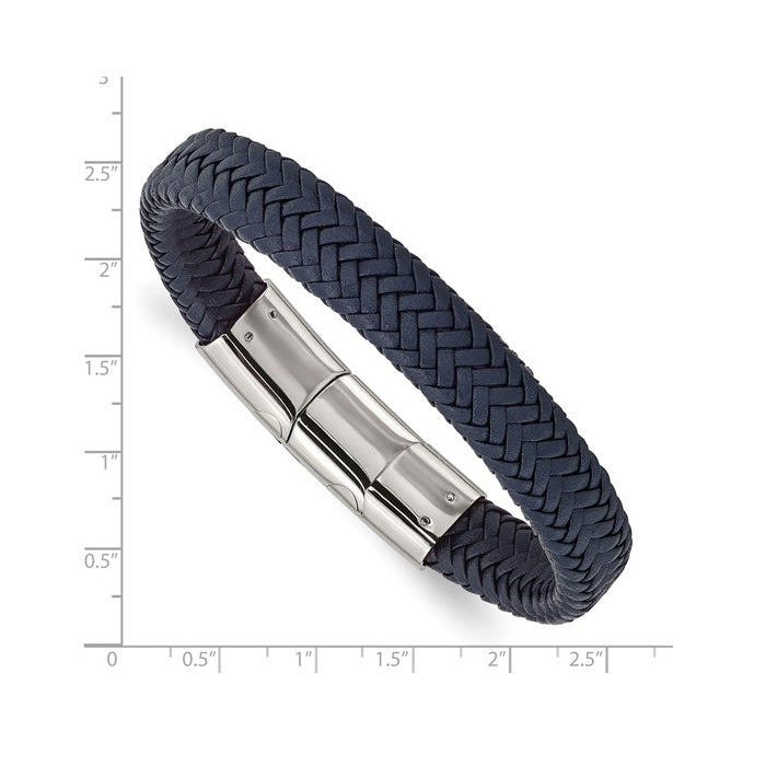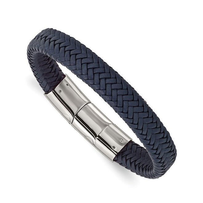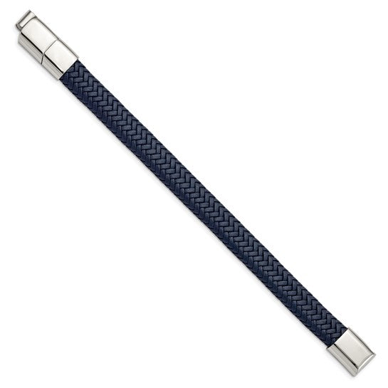 Stainless Steel Polished Navy Blue Braided Leather Men's Bracelet