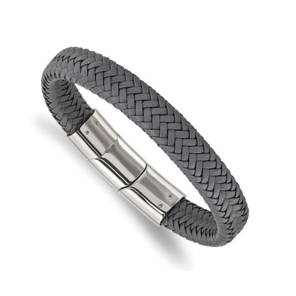 Stainless Steel Polished Gray Braided Leather Men's Bracelet