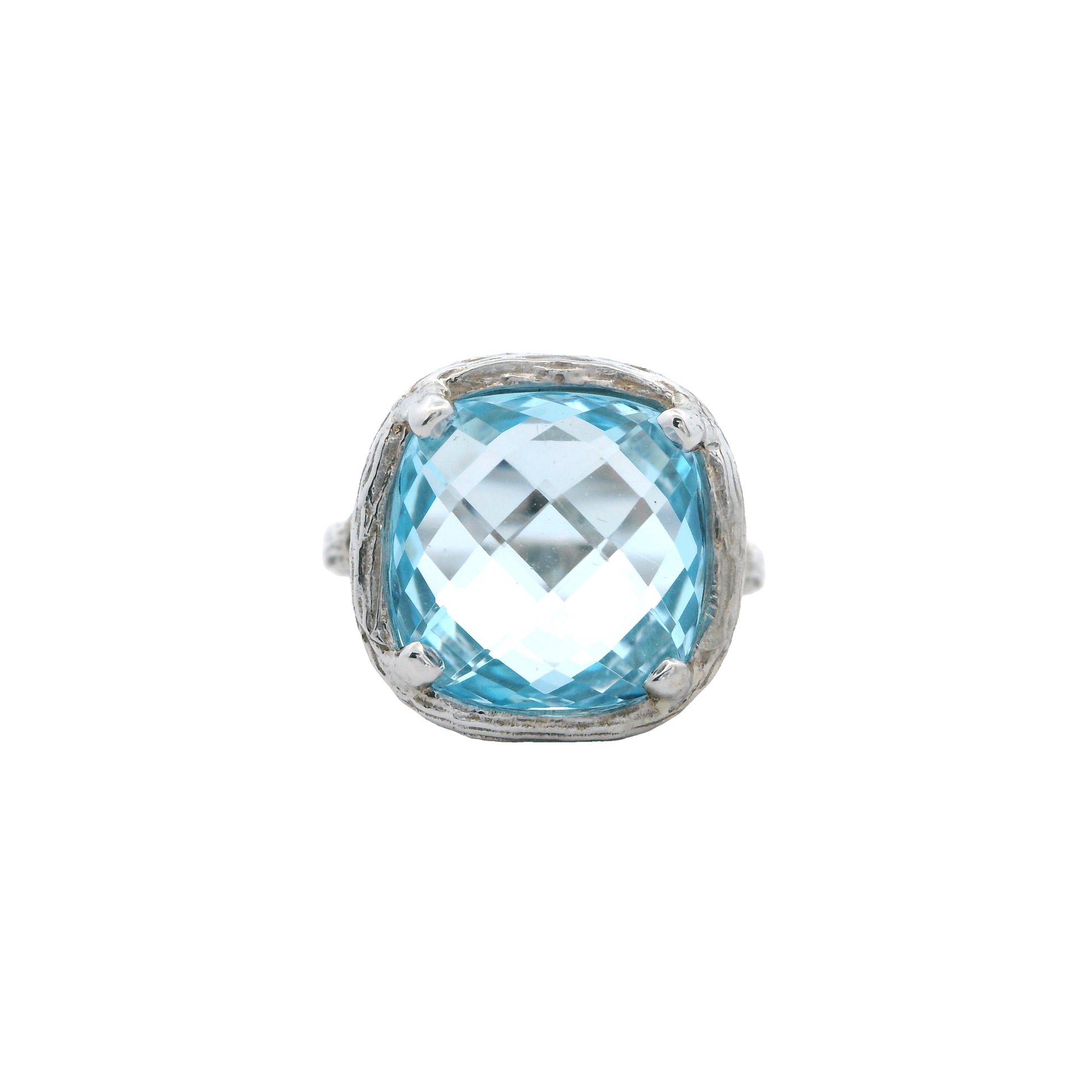 Organic branch design, featuring a stunning Blue Topaz, uniquely faceted into a double-sided checkerboard cushion cut.
