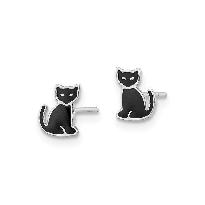 Sterling Silver Rhodium-Plated Petite Enameled Black Cat Post Earrings