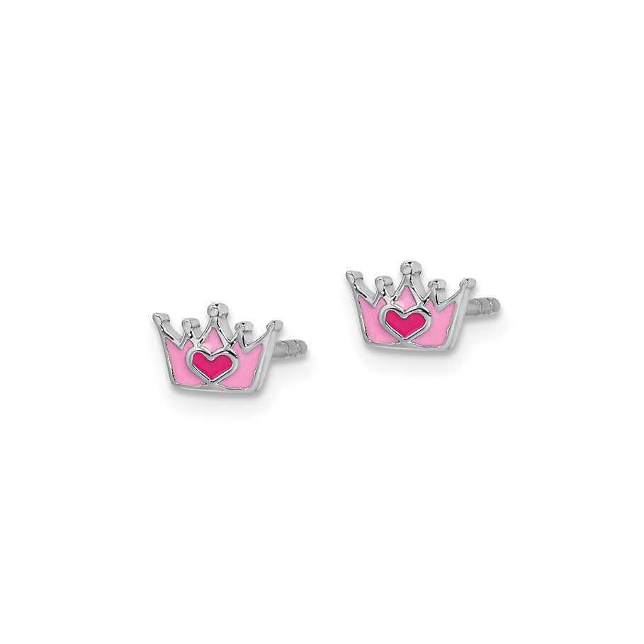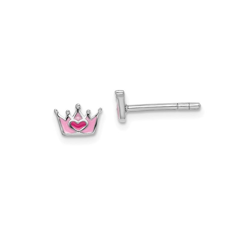 Sterling Silver Rhodium-Plated Petite Pink Enameled Crown Post Earrings