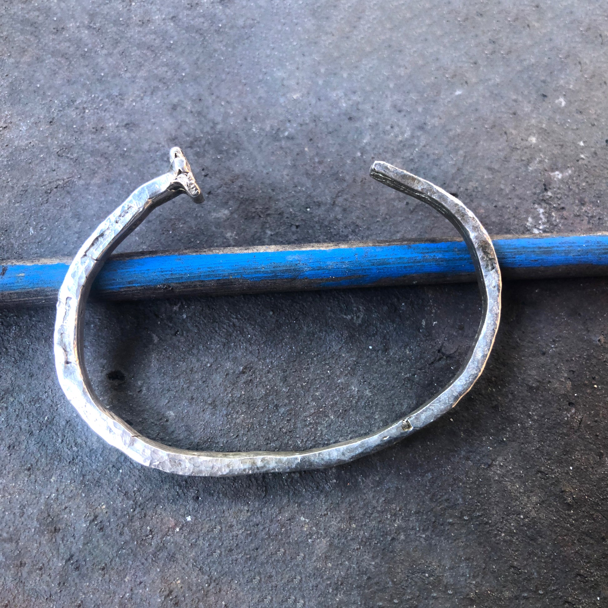 The model for this cuff was crafted from nails original to a 19th century Victorian, New Orleans, Louisiana property. The square nail was hand forged, then molded and modified to create this cuff. It is comfortable and an instant conversation piece. A favorite Tim and Mabel design. Contemporary and historic. Designed and Handcrafted in New Orleans, Louisiana.