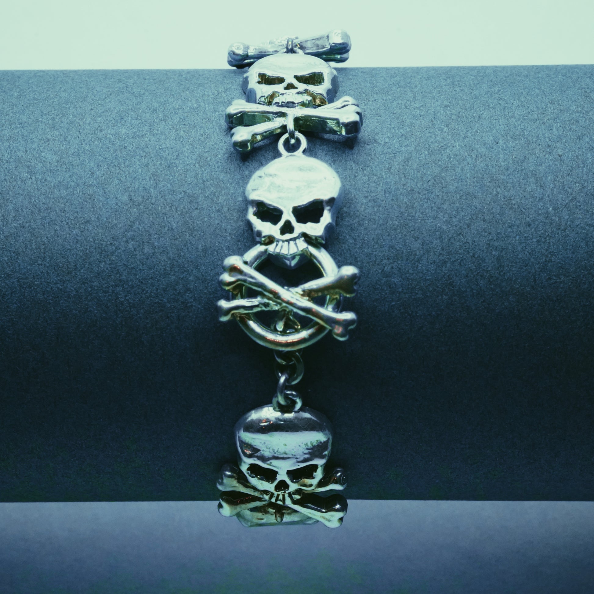 Arrr! Ye know this bracelet is calling your name. A fearsome skull and crossbones design is just right for the person who is a pirate at heart. Gift this precious treasure or claim stakes on it for yourself. Featuring a linking design with a crossbones toggle clasp, this bracelet will nicely fit a 7- 7.5 inch wrist. Larger or smaller versions available upon request. Designed and Handcrafted in New Orleans.
