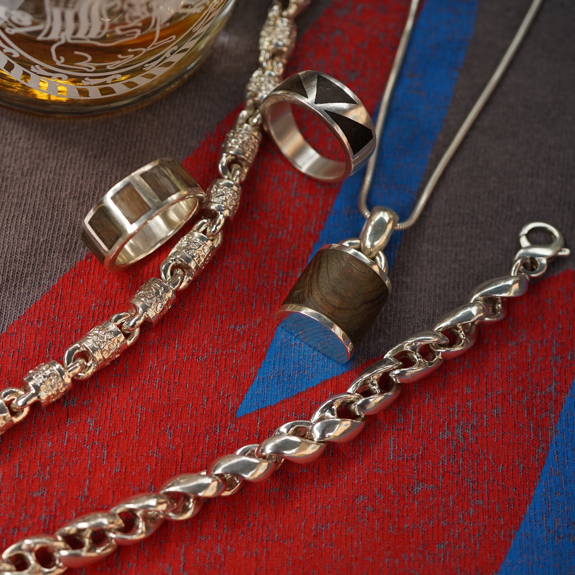 Linking Bracelet from the Textured Collection. Timeworn texture on modern forms displays respect for the marks of life’s experiences. Solid components lend to durability and a comfortable heft. Designed and Handcrafted in New Orleans.