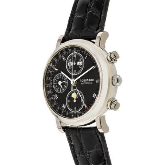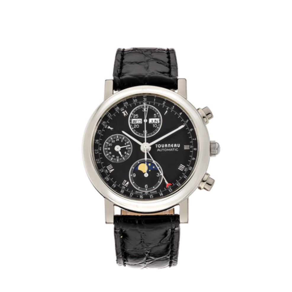 This is a pre-owned Tourneau automatic chronograph watch, reference 32001.90 It is a triple calendar watch, day/date, moonphase, 24-hour dial, self-winding wristwatch, , 25 jewels, Swiss made. 38mm Round case. It is in very good condition with the original Black Crocodile Band.