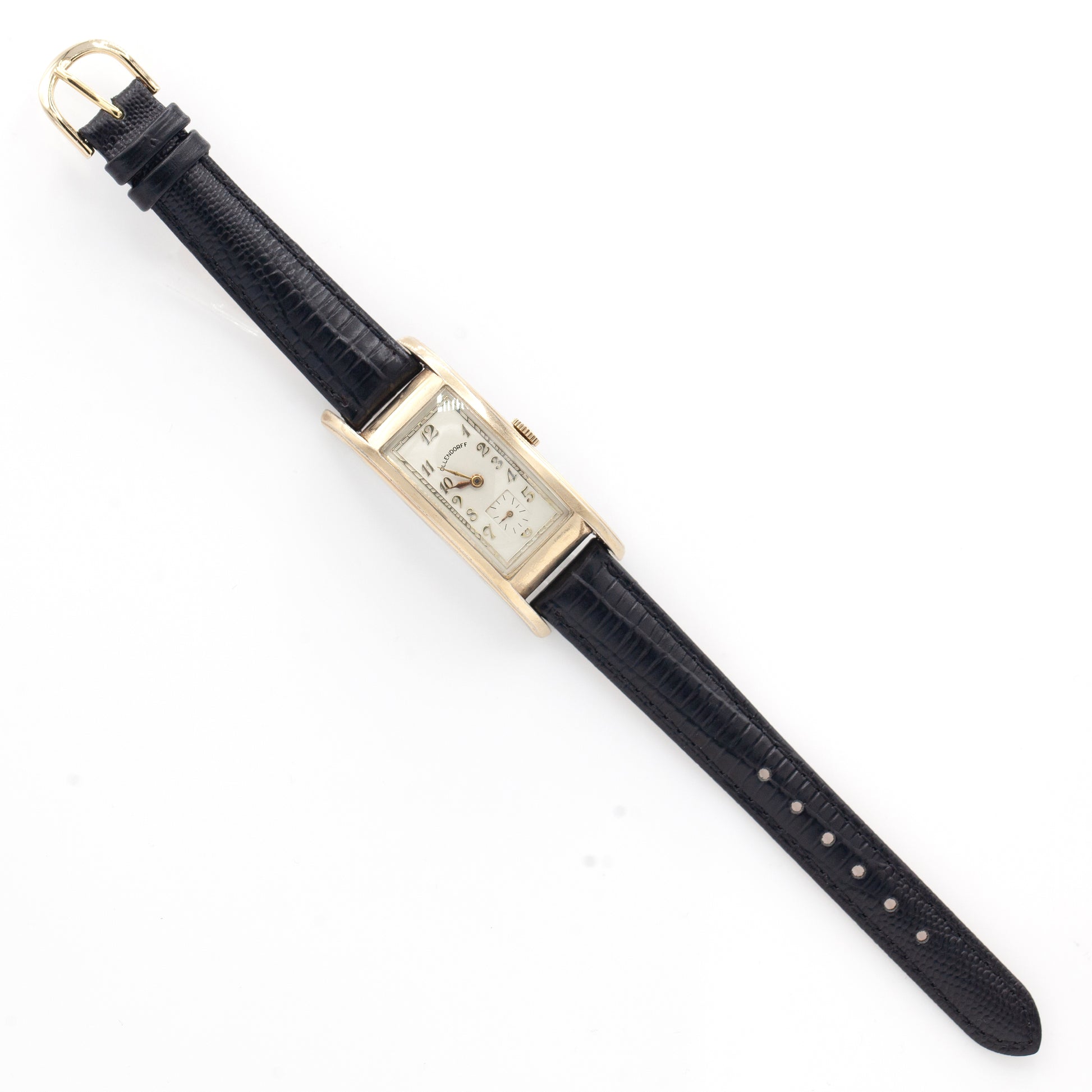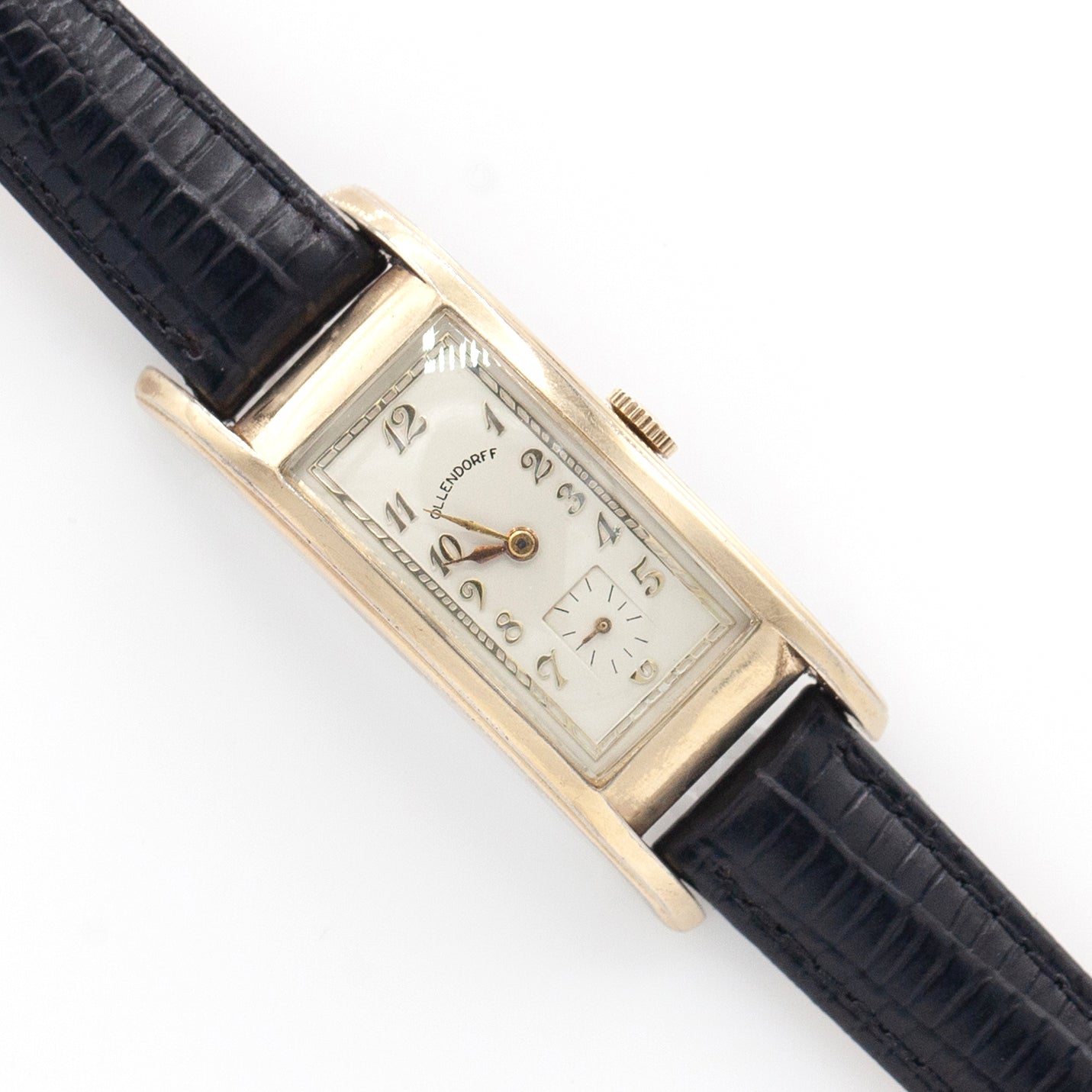 This extra long yellow gold-filled curved wristwatch from about 1938 is in excellent condition. It's a great piece of deco style. The dial has been expertly refinished. Ollendorff was a finisher and much beloved producer of high grade watches that have been generally forgotten since the 1950's. Our watchmaker believes this is a "sleeper", not having brand recognition but definitely on the level with Gruen or Bulova, in the upper-middle to higher price range. The Ollendorff Watch Company was originally founded in1868 by Isidor Ollendorff in La Chaux-de-Fonds, Switzerland.